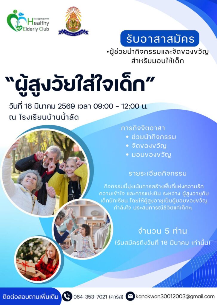 เปิดรับอาสาสมัคร จำนวน 3 ท่าน เพื่อนำผู้สูงอายุออกกำลังกายและสร้างสัมพันธ์กับผู้สูงอายุ อายุ 20 ปี ขึ้นไป ติดต่อคุณวิไล วิบูลย์อรรถ โทร 085-9526615