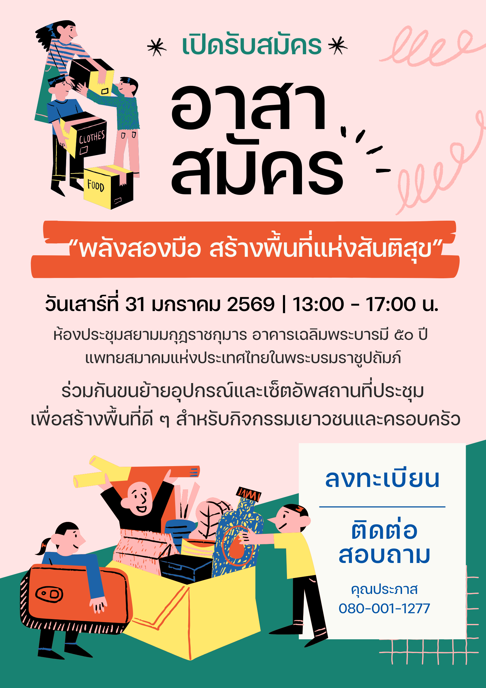4) เพื่อสร้างพลังของอาสาสมัครในการขับเคลื่อนงานด้านสถานที่ ซึ่งเป็นกลไกสำคัญที่ช่วยให้โครงการบรรลุผลสำเร็จอย่างมีประสิทธิภาพและยั่งยืน