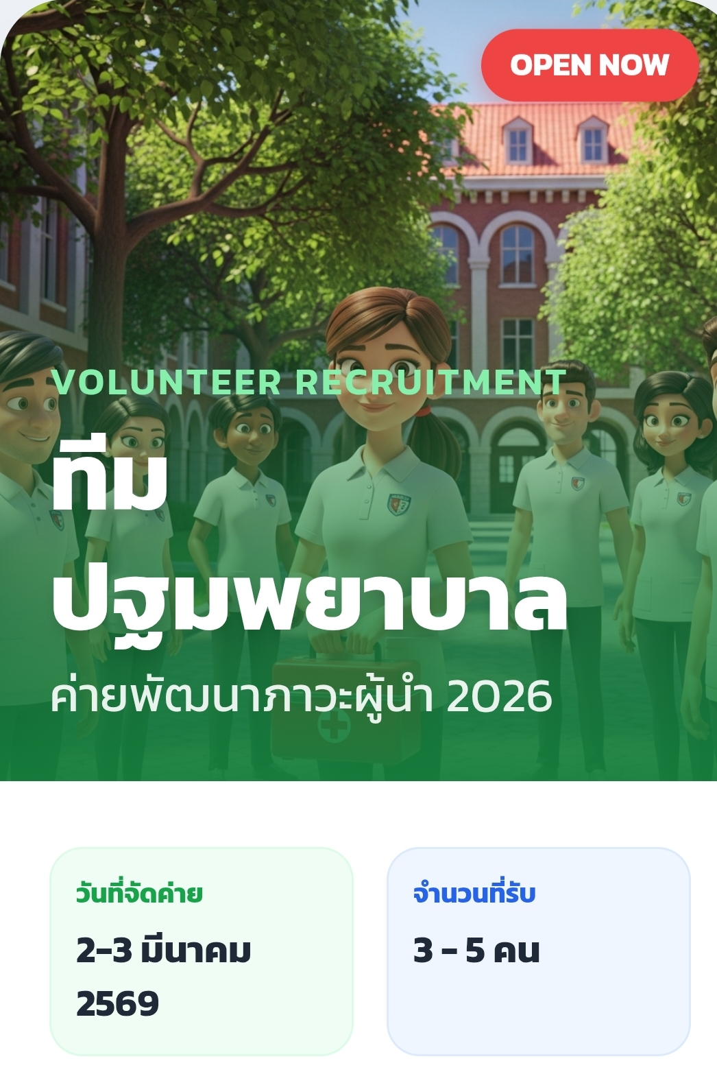 รับสมัครจิตอาสา งานปฐมพยาบาล ในค่ายพัฒนาภาวะผู้นำ วันที่ 2-3 มีนาคม 2026 ที่ มหาวิทยาลัยเกษตรศาสตร์ วิทยาเขตกำแพงแสน