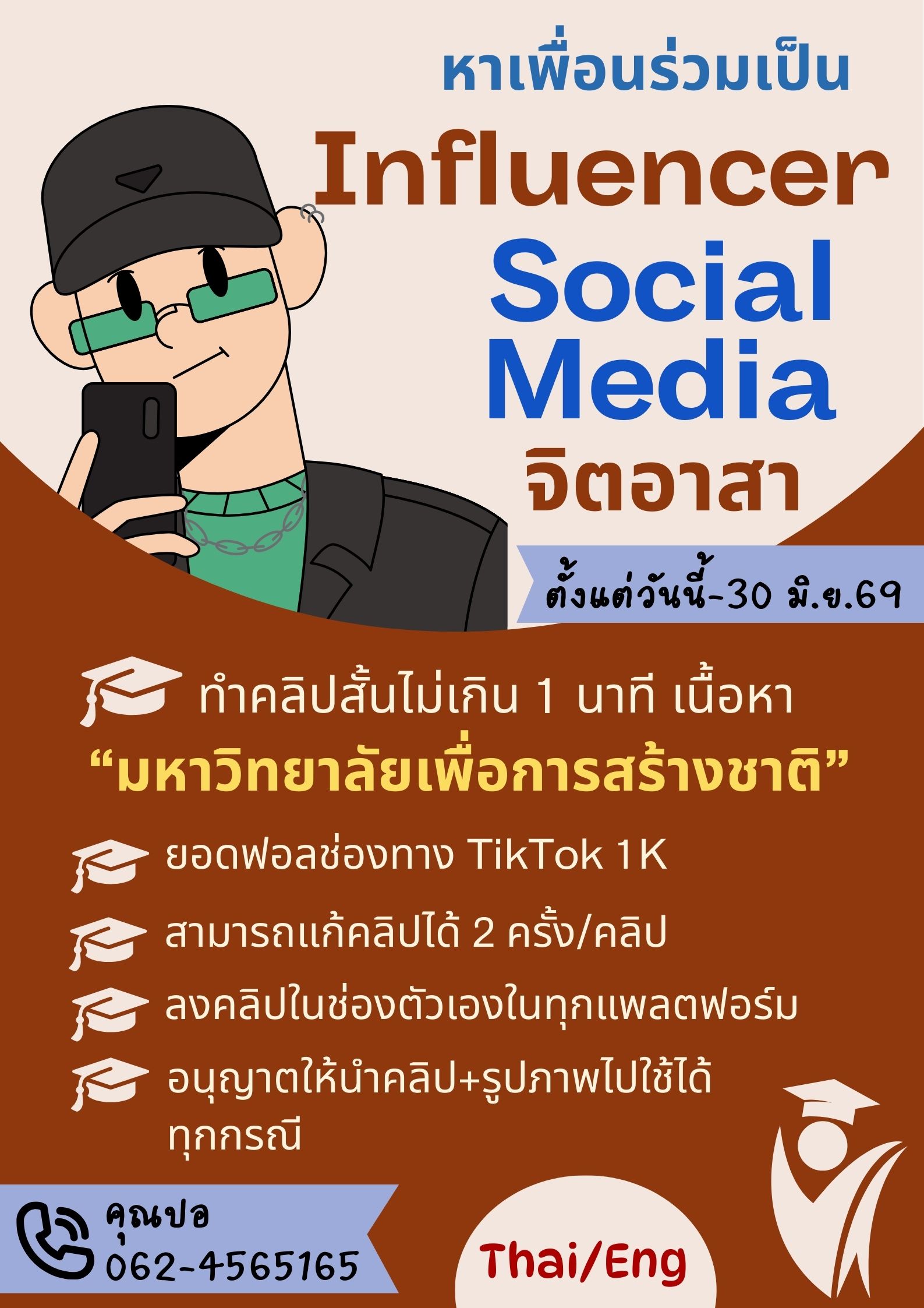 จึงต้องการ Influencer อาสาสมัครมาร่วมเผยแพร่แนวคิดดีๆ และผลการจัดอันดับที่จะมีการประกาศผลในงานสัมมนาระดับนานาชาติ ในกลางเดือนมิถุนายน 2569
