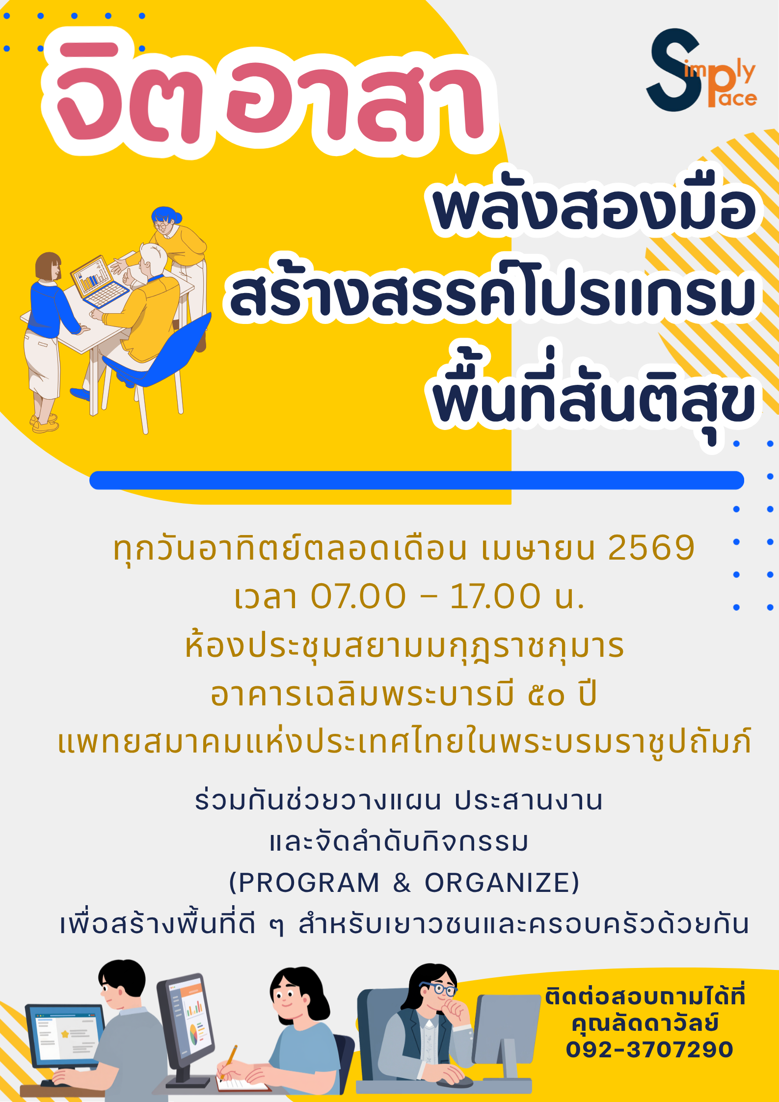 1 เมษายน @ 7:00 AM - 30 เมษายน @ 5:00 PM “พลังสองมือ สร้างสรรค์โปรแกรมพื้นที่สันติสุข” ขอเชิญร่วมเป็นส่วนหนึ่งของพลัง […] สมัคร Now Free
