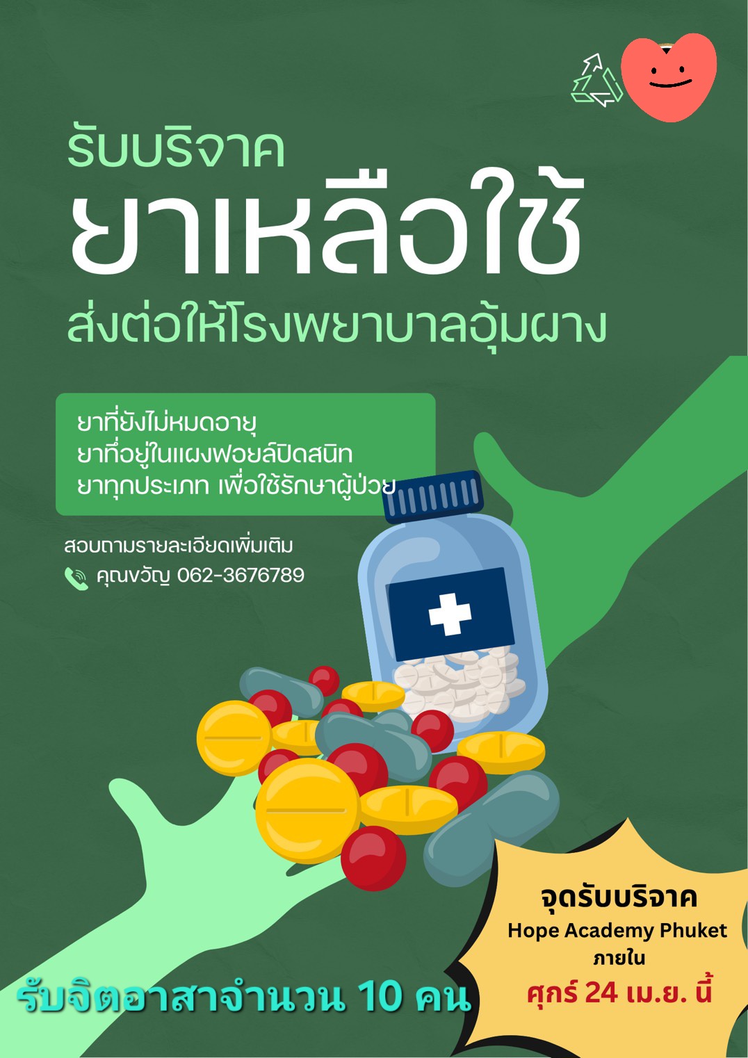 10 เมษายน @ 1:03 PM - 25 เมษายน @ 1:03 PM รับบริจาคยาเหลือใช้ส่งต่อให้โรงพยาบาลอุ้มผาง รับจิตอาสาเป็นเจ้าหน้าที่รับบริจาคยาจากผู้มีใจมอบยาเหลื […] สมัคร Now Free