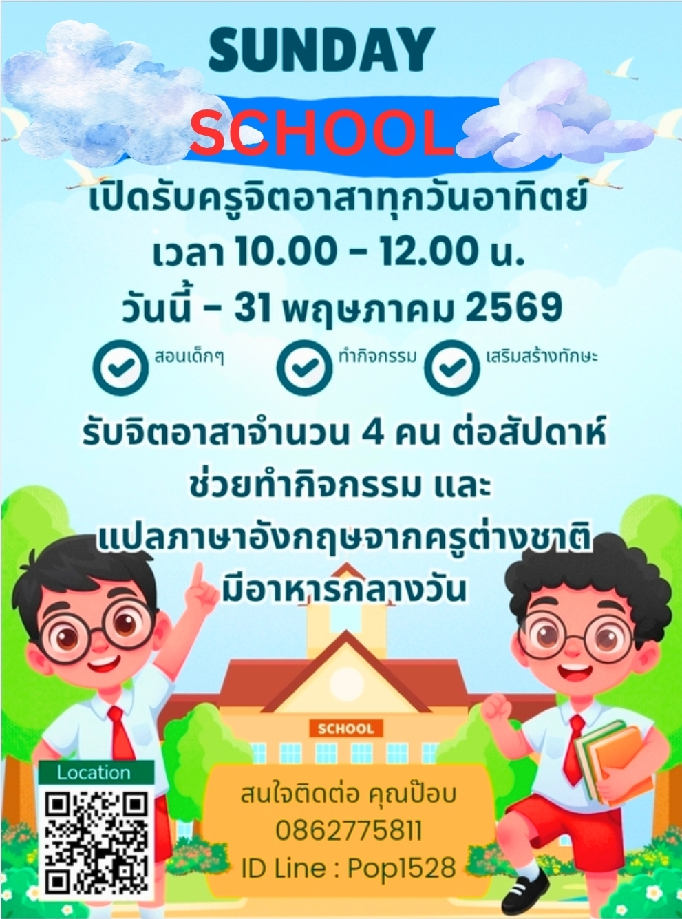 10 เมษายน @ 1:21 PM - 31 พฤษภาคม @ 3:21 PM Sunday School รับจิตอาสาจำนวน 4 ท่านต่อสัปดาห์ ในทุกๆวันอาทิตย์ของแต่ […] สมัคร Now Free