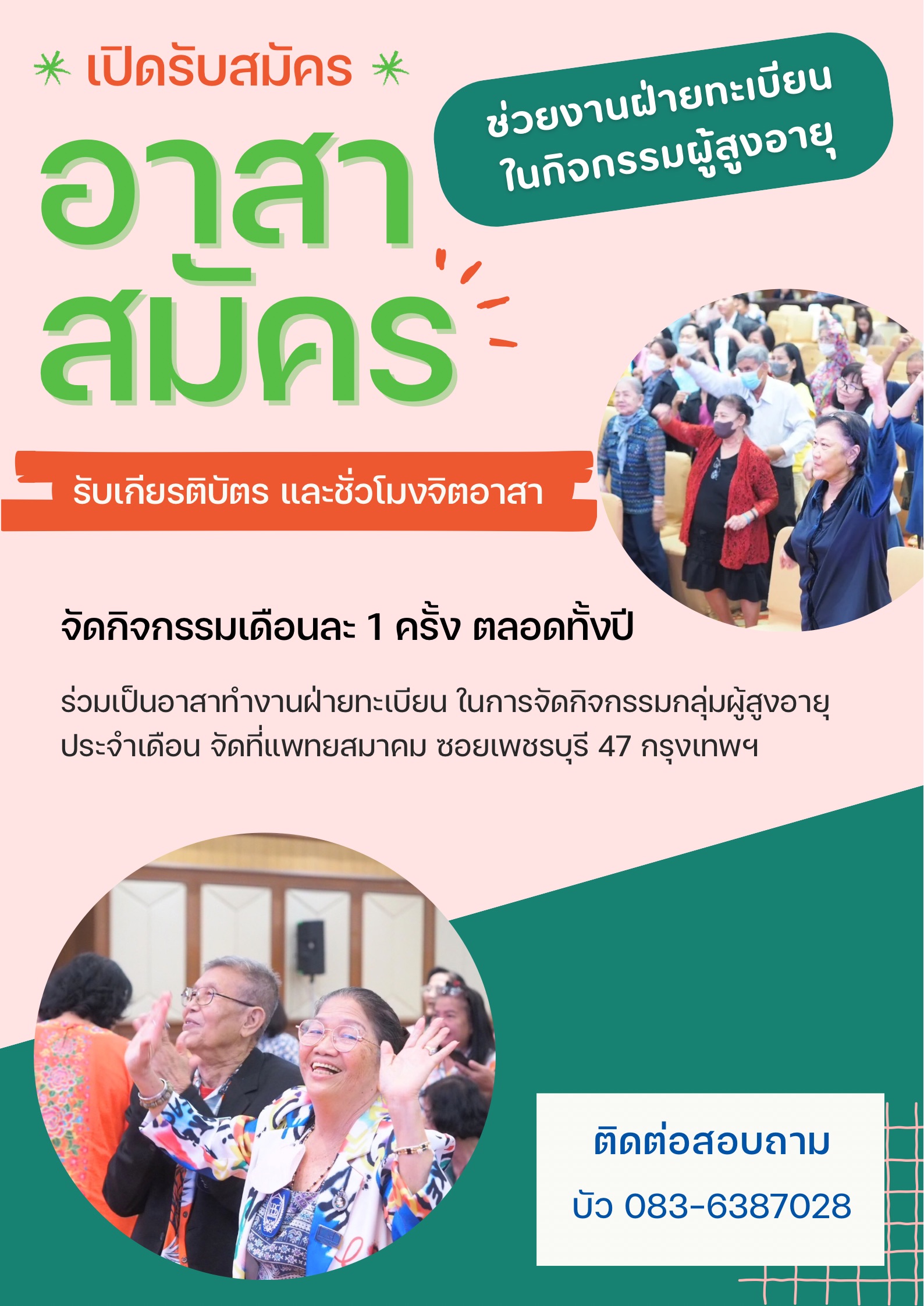 มี.ค. 10 10 มีนาคม @ 10:11 PM - 31 ธันวาคม @ 10:11 PM อาสาช่วยงานฝ่ายทะเบียน กิจกรรมผู้สูงอายุ สมัคร Now Free