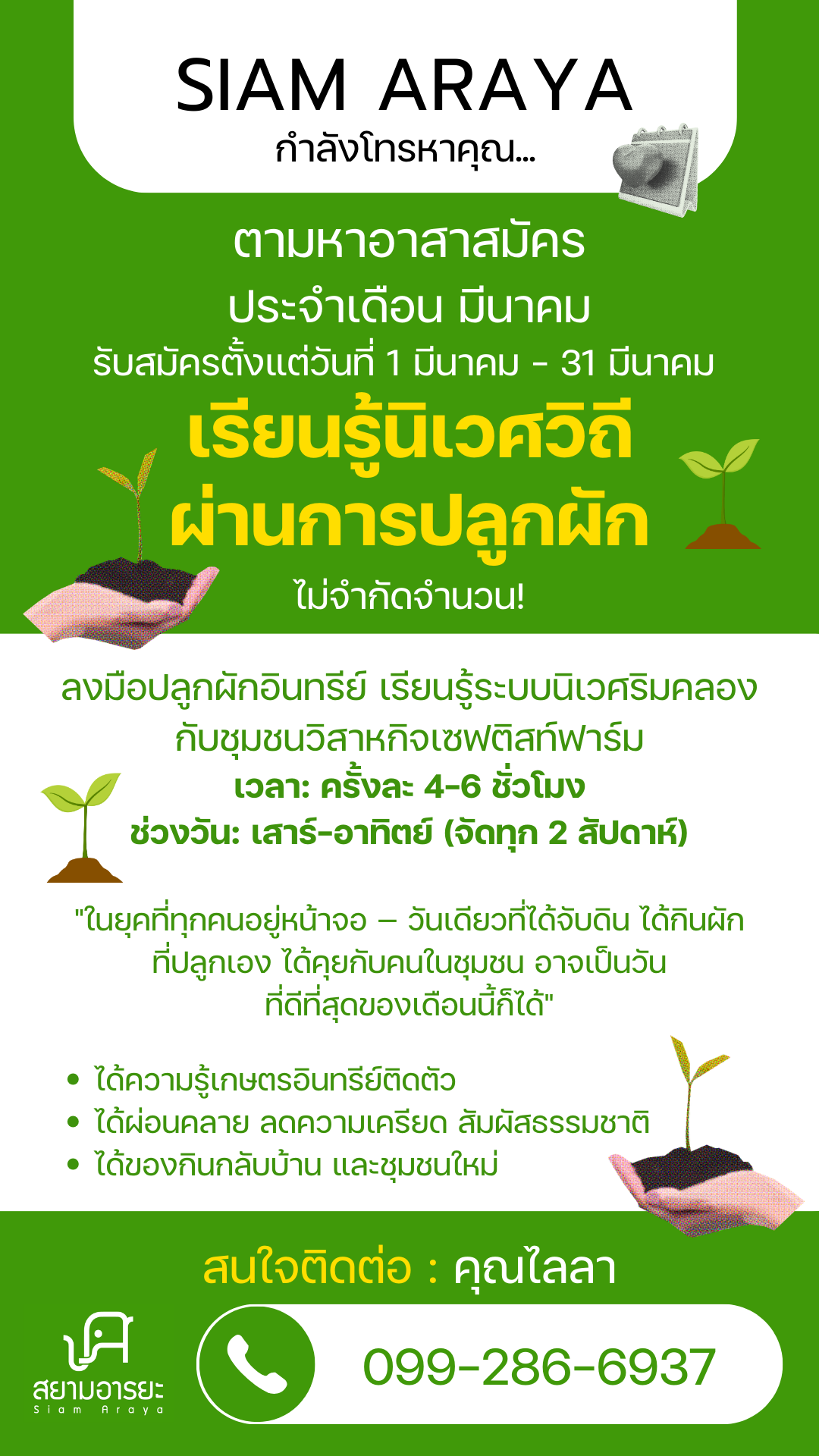 มี.ค. 14 14 มีนาคม @ 8:00 AM - 29 มีนาคม @ 4:00 PM เรียนรู้นิเวศวิถี ผ่านการปลูกผัก — เซฟติสท์ฟาร์ม สมัคร Now Free