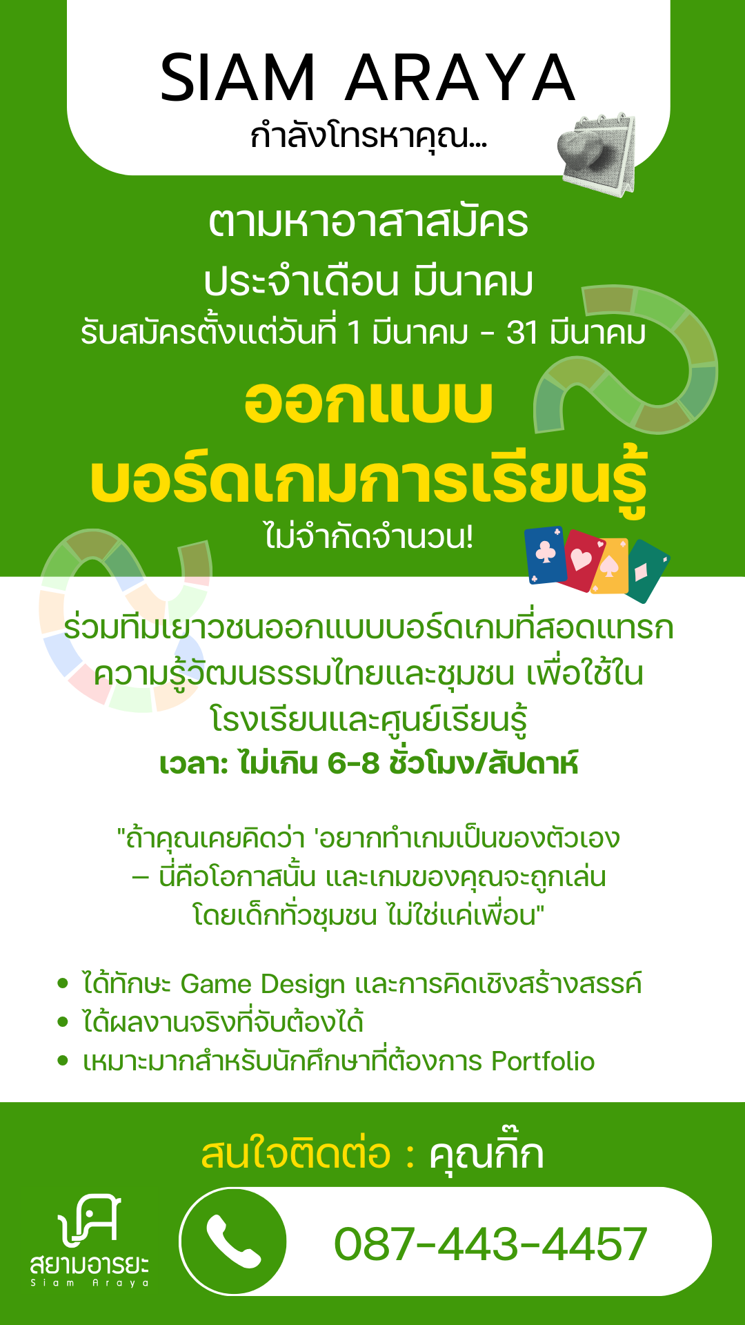 มี.ค. 11 11 มีนาคม @ 8:30 AM - 31 มีนาคม @ 4:00 PM เยาวชนสยามอารยะ — บอร์ดเกมการเรียนรู้ 🎲🎮🧩 สมัคร Now Free