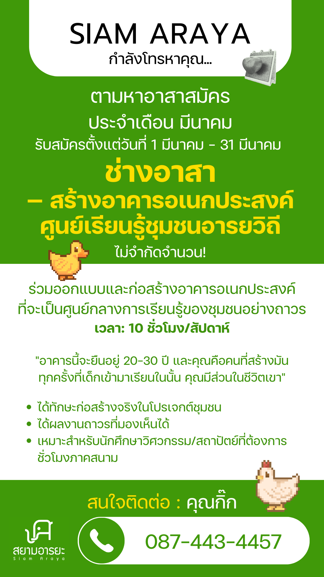 มี.ค. 11 11 มีนาคม @ 7:30 AM - 31 มีนาคม @ 4:30 PM ช่างอาสา — สร้างอาคารอเนกประสงค์ ศูนย์เรียนรู้ชุมชนอารยวิถี 🦺🔨🔧 สมัคร Now Free