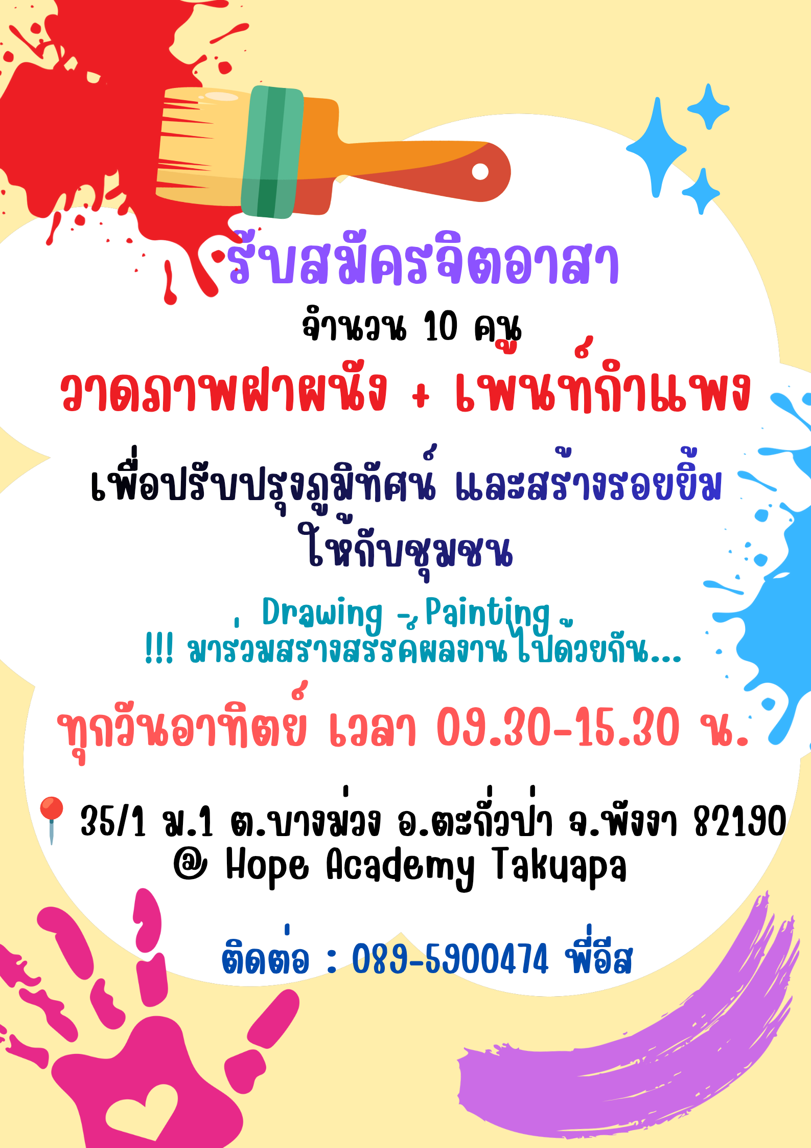 มี.ค. 14 14 มีนาคม @ 9:30 AM - 31 ธันวาคม @ 3:30 PM รับสมัครจิตอาสา วาดภาพบนฝาผนัง + เพ้นท์กำแพง สมัคร Now Free