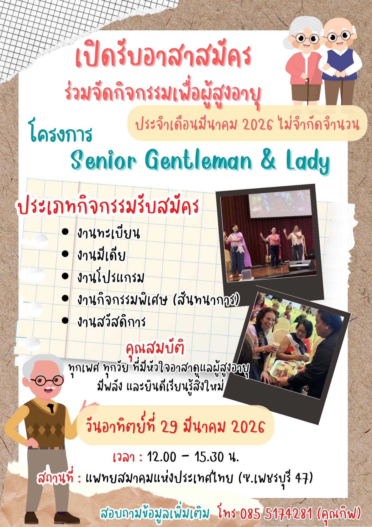 29 มีนาคม @ 12:00 PM - 3:30 PM รับอาสาสมัคร ร่วมจัดกิจกรรมเพื่อผู้สูงอายุ Senior Gentleman & Lady 📌 ประเภทกิจกรรมรับสมัคร (สามาร […] Free
