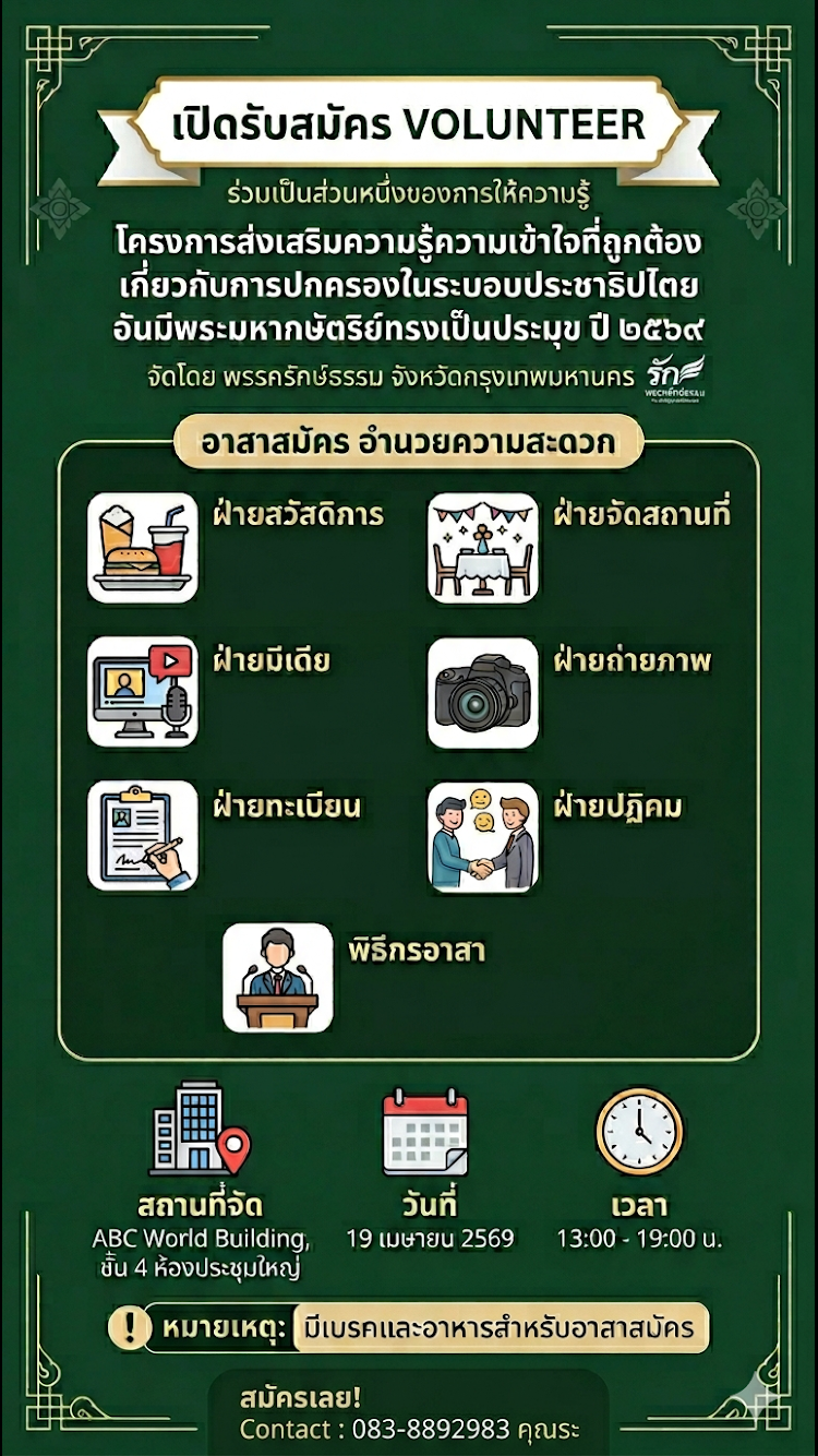17 เมษายน @ 8:23 PM - 19 เมษายน @ 8:24 PM รับสมัคร volunteer : อาสาสมัคร โครงการส่งเสริมความรู้ความเข้าใจที่ถูกต้องเกี่ยวกับการปกครองในระบอบประชาธิปไตย พรรครักษ์ธรรม จังหวัดกรุงเทพมหานคร -แต่งกายสุภาพ -อาสาสมัครเดินทา […] สมัคร Now Free
